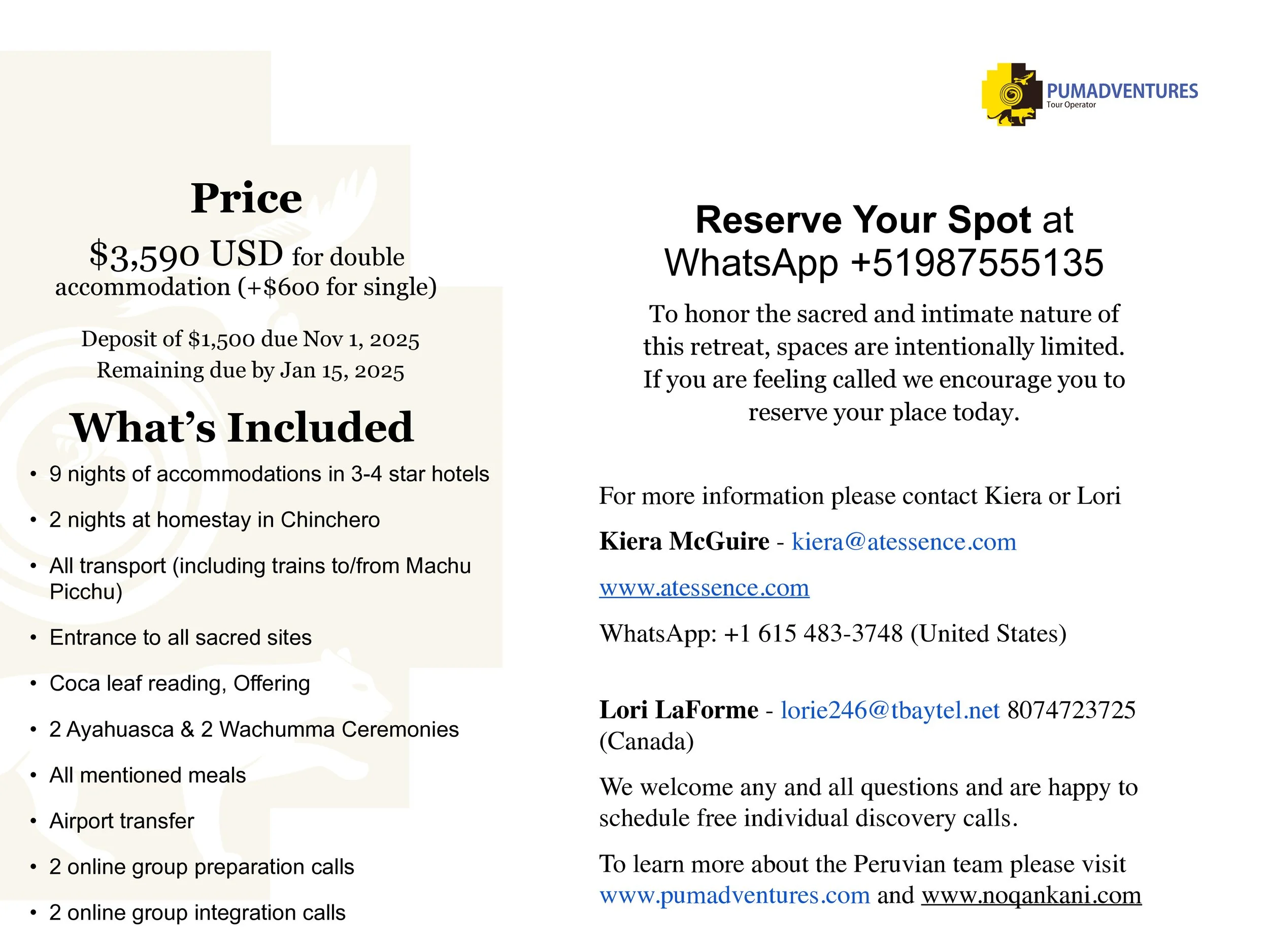 At the heart of this journey is the sacred guidance of our Peruvian family—wisdom keepers, medicine carriers, and ceremonial stewards from the communities of Noqankani and Pumadventures. Rooted in the highlands of Chinchero and the ancient traditions of the Andes, they walk in deep communion with Pachamama, the Apus (mountain spirits), and the sacred elements of nature.